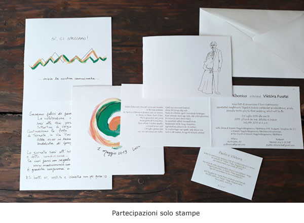 Realizziamo inoltre partecipazioni con stampe semplici su cartoncino ecologico bianco o avorio, partendo anche da immagini, foto, caricature, disegni liberi.