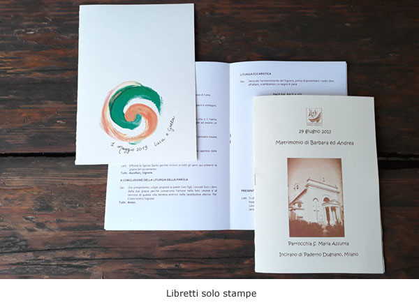 Con lo stesso stile e partendo sempre dagli stessi materiali vengono realizzati anche Libretti per Cerimonia coordinati con copertina su cartoncino ecologico gr/m 160 e interno su carta bianca, avorio o riciclata (gr/m 80), con semplice graffettatura o rilegatura in cordini o rafia.