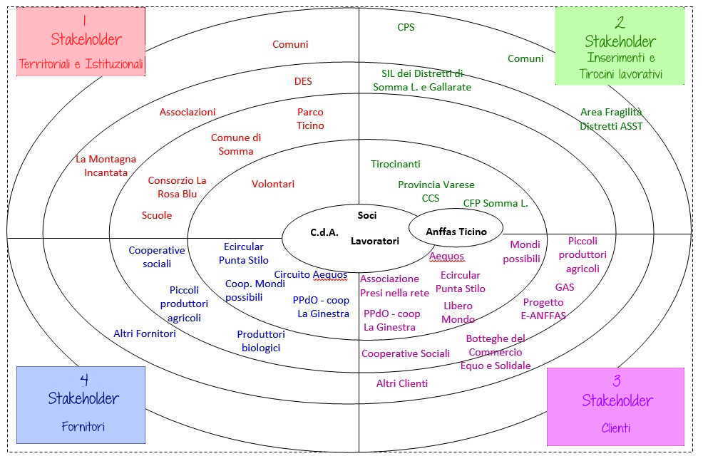 La mappa dei portatori d’interesse (stakeholder) vuole rappresentare, in forma grafica, il sistema delle relazioni della cooperativa Radici nel Fiume, individuando i soggetti con cui questa si rapporta e che, con dividersi gradi di influenza, hanno parte attiva nella vita e nei processi della cooperativa.